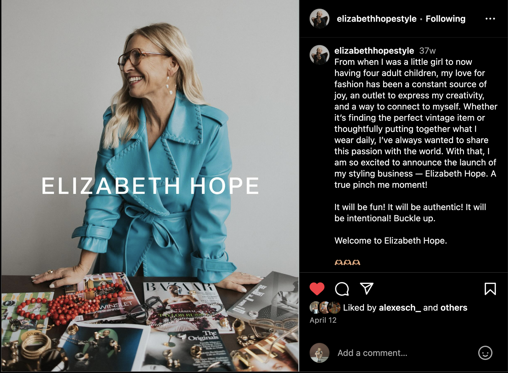 “From when I was a little girl to now having four adult children, my love for fashion has been a constant source of joy, an outlet to express my creativity, and a way to connect to myself. Whether it’s finding the perfect vintage item or thoughtfully putting together what I wear daily, I’ve always wanted to share this passion with the world. With that, I am so excited to announce the launch of my styling business — Elizabeth Hope. A true pinch me moment!